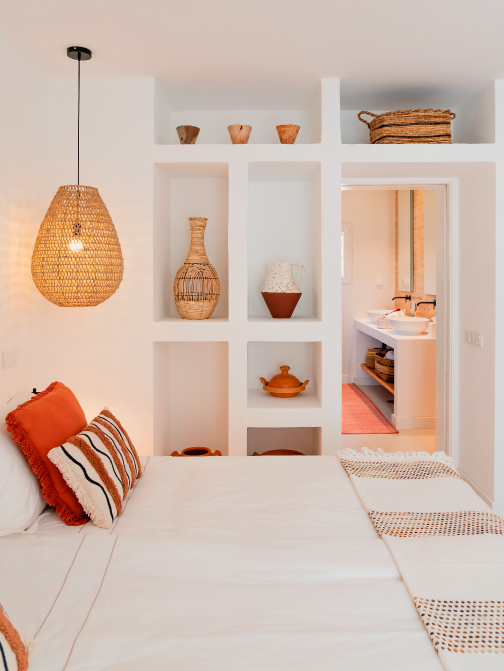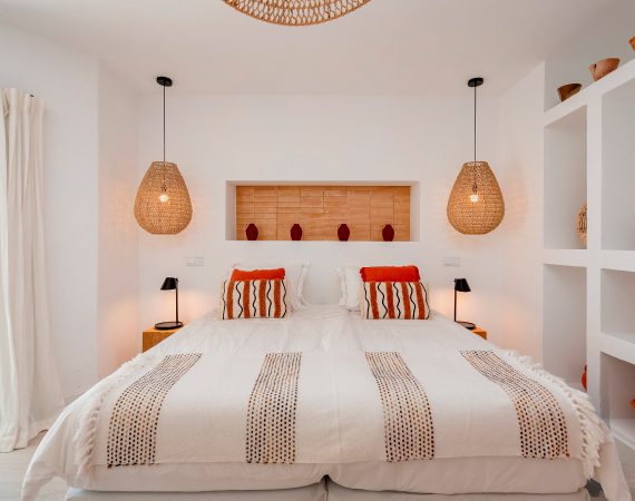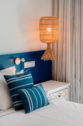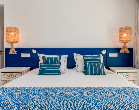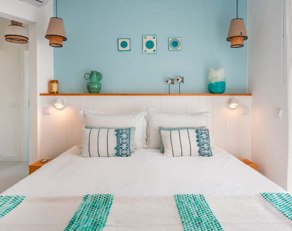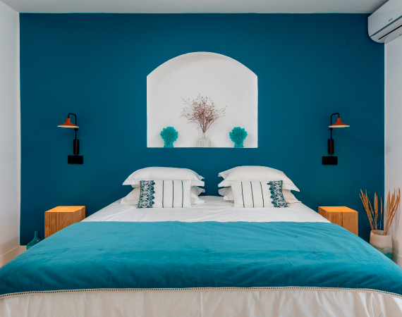 A choice of four en suite rooms, each named after a local beach: Praia Luz, Paraïso, Falesia or Rocha, in different shades of blue, green, turquoise or ochre. Each room has a view of the sea, the pool or an intimate patio.