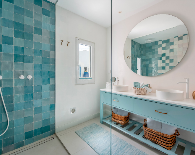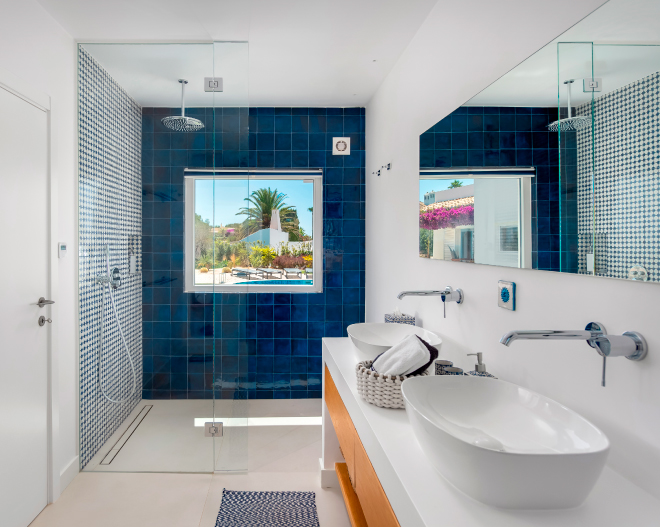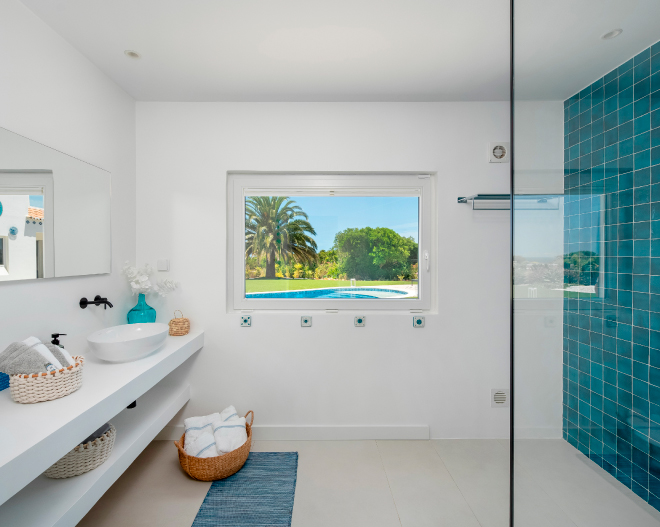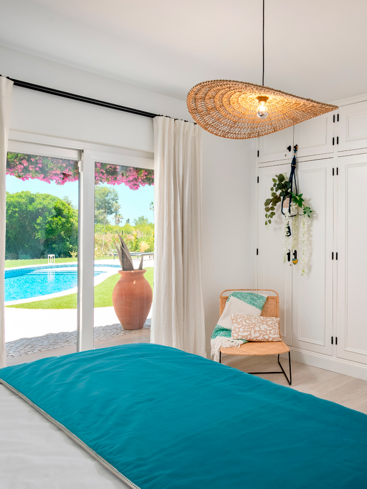 Rui gloria, a local photographer from Portimao, lent his lens to capture the deep blue colors of Paraïso and the nearby caves, whose natural window decorates the room. The 200x200cm bed, under its large rattan cloud, is welcoming and at the height of comfort. The bathroom and large walk-in shower are in the same tones, with local zellige ceramics. Double basins in the shape of large bowls are set on a polished concrete surface in the South Portuguese tradition. A separate walk-in wardrobe provides the ultimate in comfort.