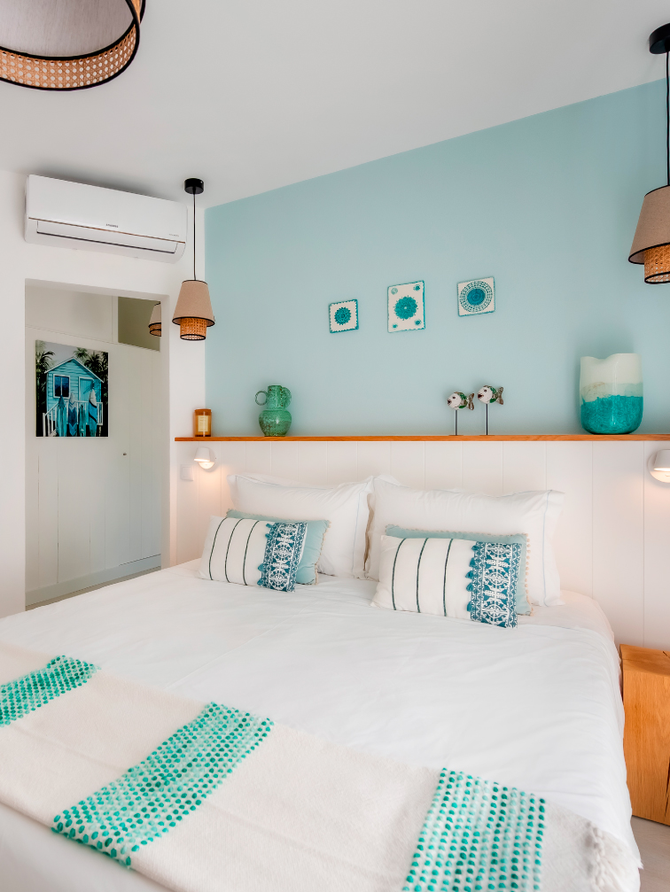 Facing north, with a view of the patio and its fountain, Luz is the coolest room. Here, the color blue comes in sky blue and water green, like the ocean water on the beach of “Luz”, where the light is so special, tinged with pearly pearl or silver-gray. This en suite room is a seaside cocoon of well-being, luminous with its white wood panelling, chic and timeless with a cosy atmosphere, natural materials, welcoming furniture and large, comfortable bedding.
