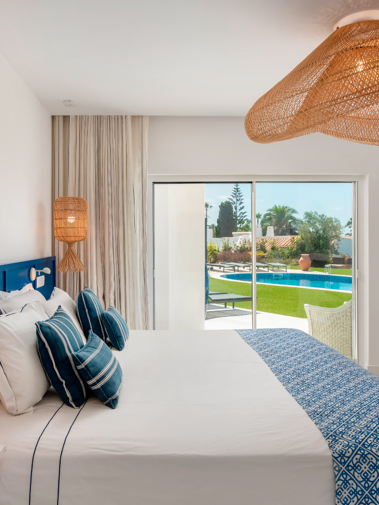 Facing south-east, the Paraïso room enjoys plenty of sunshine and a superb panorama, with sunrise over the sea and pool. The color blue here is navy, like the deep blue waters of the beach that bears its name. A series of Vista Allegre Portuguese porcelains and pretty bathers complete this resolutely seaside decor. This en-suite room is a cocoon of well-being by the sea, chic and comfortable, with a cosy atmosphere, natural materials, welcoming furnishings and very large, comfortable bedding.