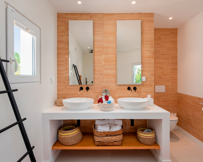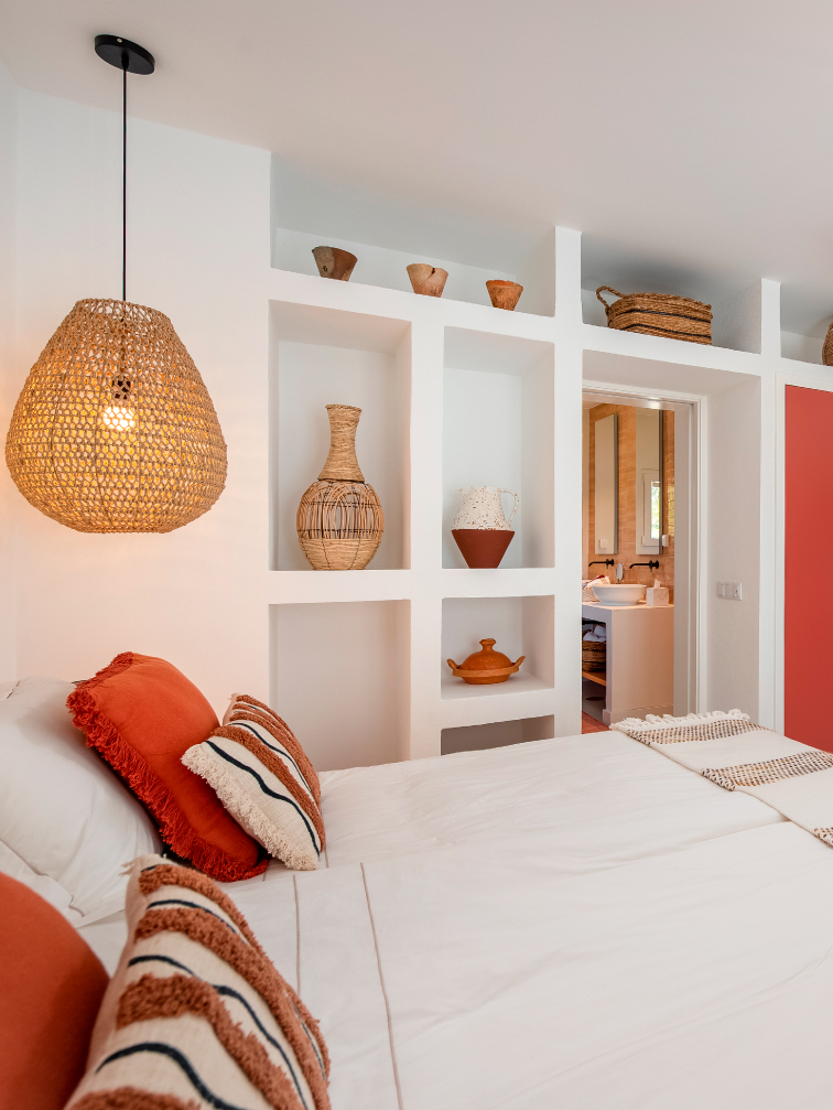 White, wood, ochre and rattan give Rocha its naturally warm notes. Natural terracotta pottery from Morocco or the French Atlantic coast adds a very personal touch of authenticity and invites you to travel. The bathroom is decorated in the same tones, with local zellige ceramics and a large soaking tub. A series of ceramics by Lisbon craftsman Nunes completes the warm decor. Double basins in the shape of large bowls are set on a polished concrete surface in the South Portuguese tradition. Large cupboards make for comfortable seating.